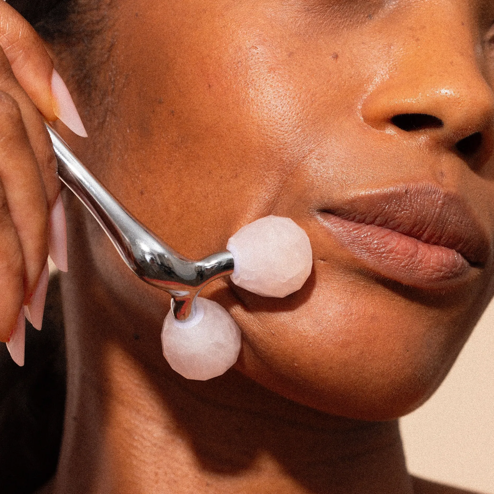 Un beauty roller au design en “V” avec des sphères en quartz rose qui sculptent et redessinent les contours du visage. Effet liftant immédiat.